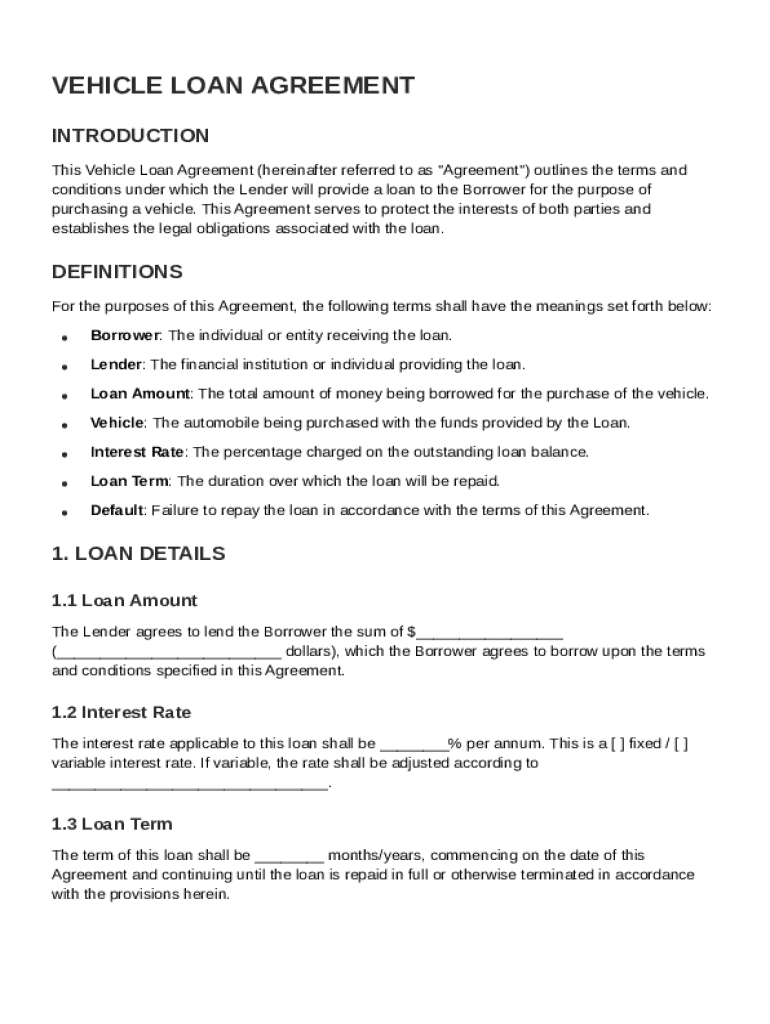 A Vehicle Loan Agreement Template is a document outlining the terms and conditions of a loan for purchasing a vehicle.
