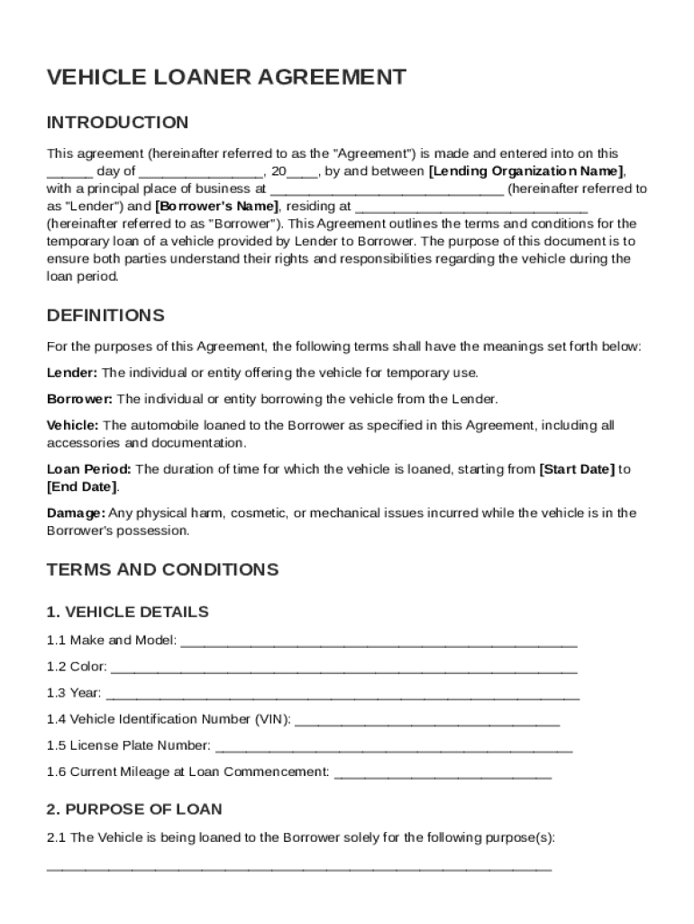 This document outlines the terms and conditions for the temporary loan of a vehicle from Lender to Borrower, detailing obligations, responsibilities, and terms for both parties.