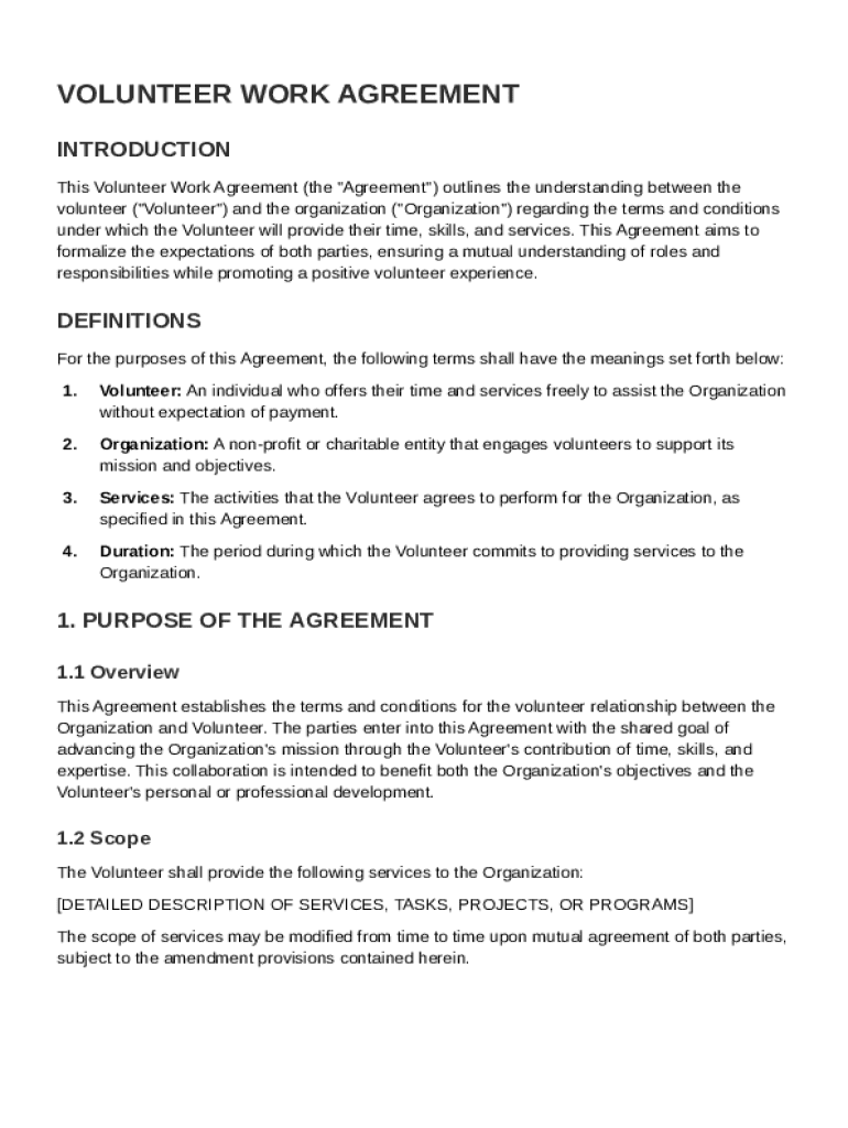 A Volunteer Work Agreement Template is a document that outlines the terms and conditions between an organization and a volunteer regarding their volunteer work.