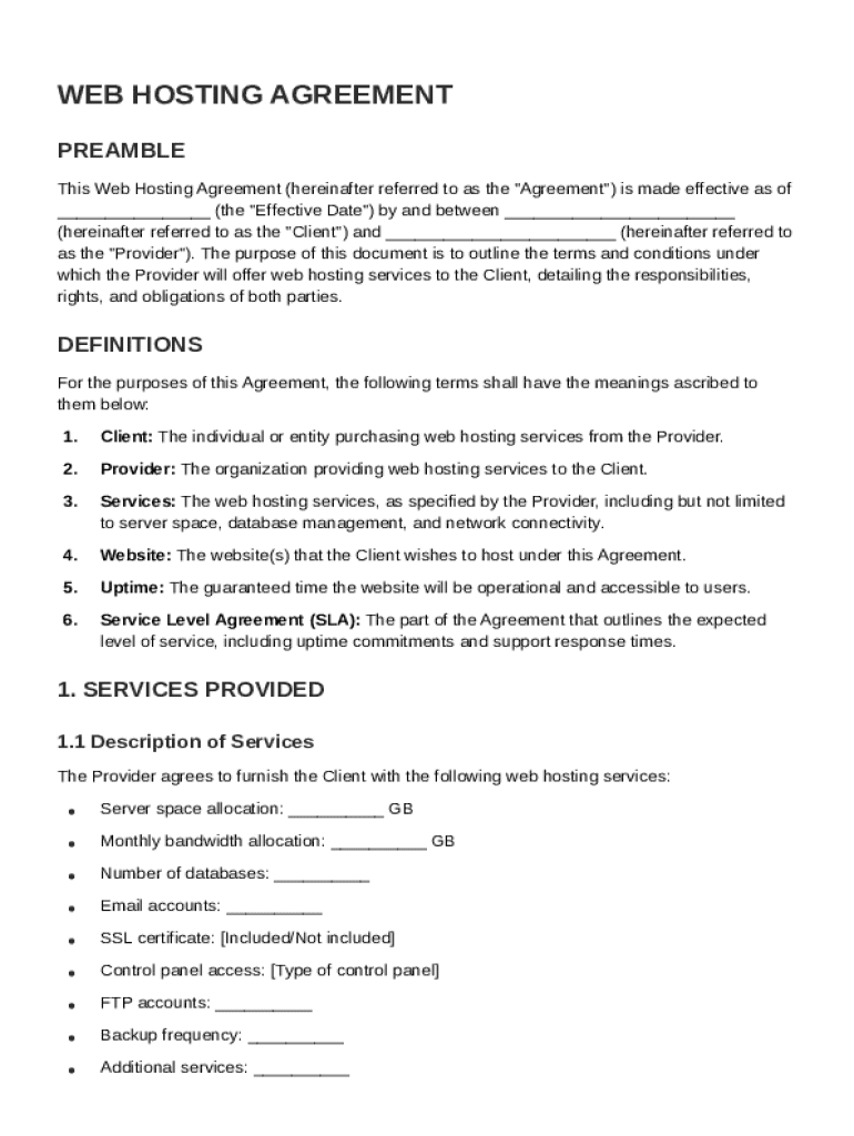 Filling out a web hosting agreement template form involves understanding key components of web hosting and ensuring both parties are clear on the terms. Begin by identifying the Client and the Provider, then specify the services being offered, including essential details about uptime, payment terms, and dispute resolution.
