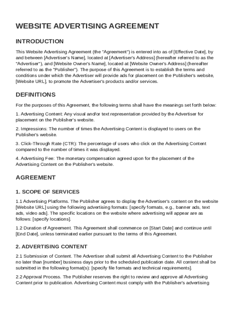 A Website Advertising Agreement Template is a legal document that outlines the terms and conditions between a website owner and an advertiser for the placement of advertisements on the website.