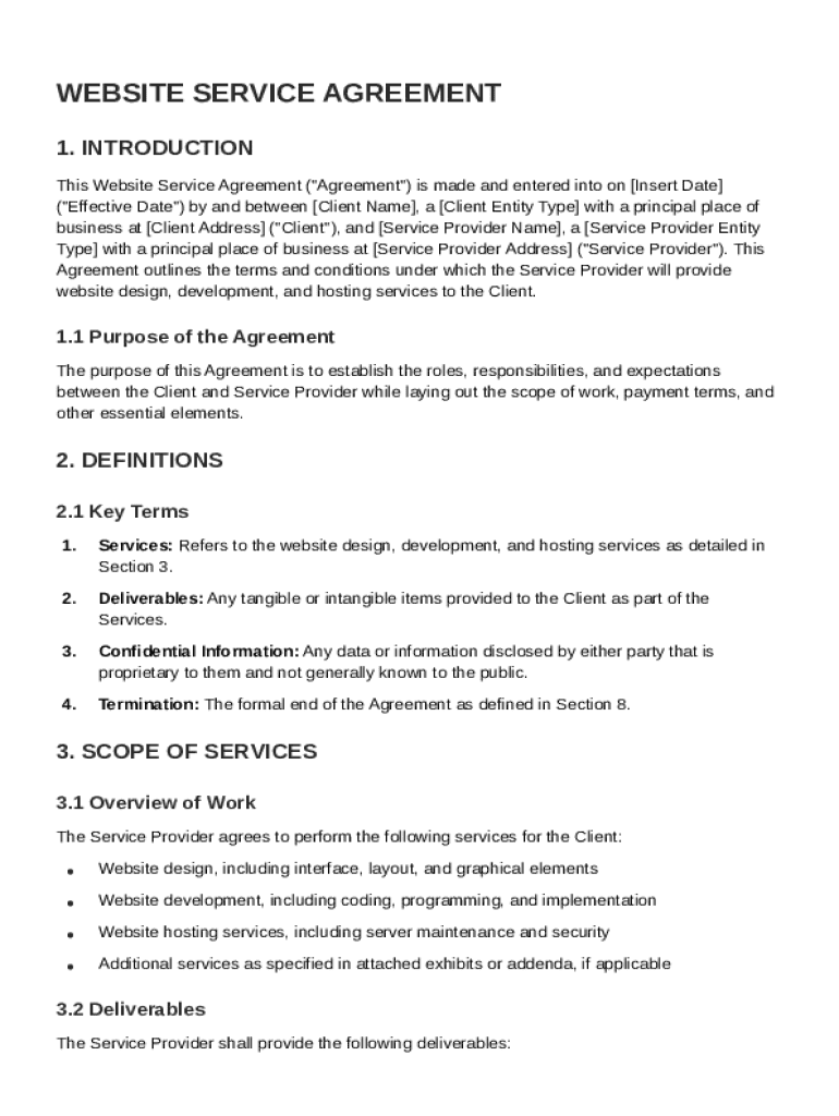 A comprehensive Website Service Agreement encompasses several key components that must be clearly defined for effective service delivery.