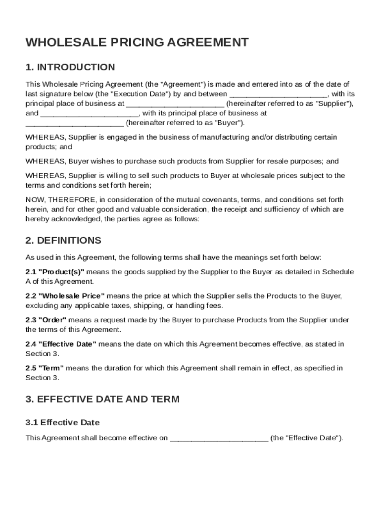 The structure of a Wholesale Pricing Agreement is integral to its effectiveness. It includes various components that detail the responsibilities and expectations of all parties involved.