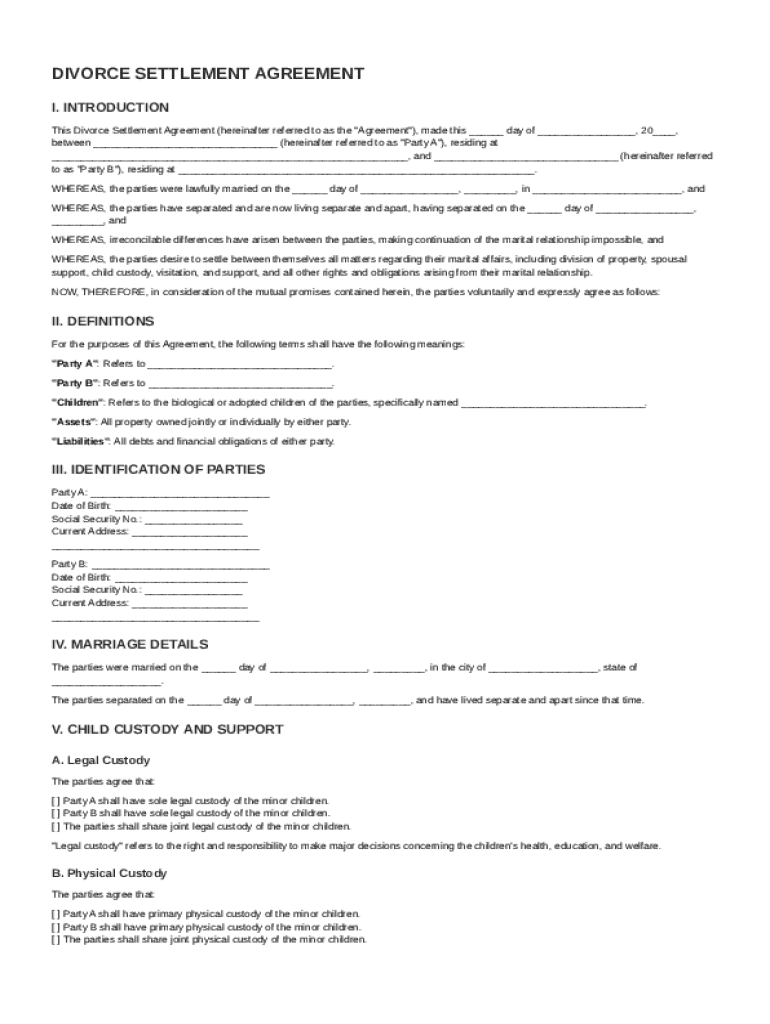A divorce settlement agreement is a legally binding document detailing the terms agreed upon by both spouses regarding the dissolution of their marriage. This agreement is critical for ensuring that both parties understand their rights and obligations, specifically concerning asset division, child custody, and support. Without this agreement, the divorce process may become convoluted and may invite legal complications.