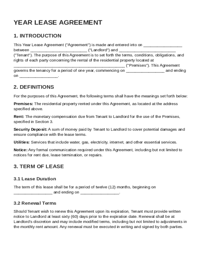A Year Lease Agreement is a legal contract that details the rental terms between a landlord and a tenant for a year-long period.