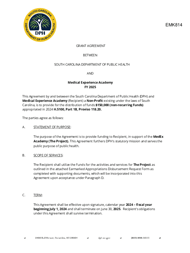 This Grant Agreement outlines the terms and conditions for the distribution of funds to Medical Experience Academy from the South Carolina Department of Public Health for fiscal year 2025, in support