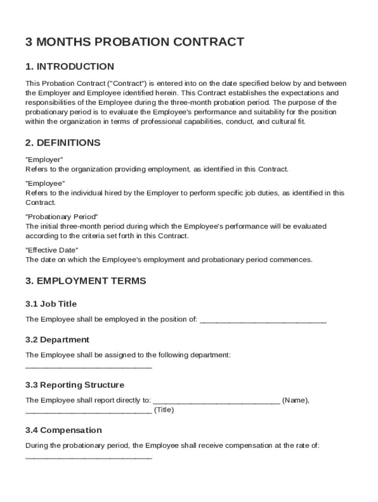 A 3 Months Probation Contract Template is a legal document that outlines the terms and conditions of employment during a three-month probationary period.