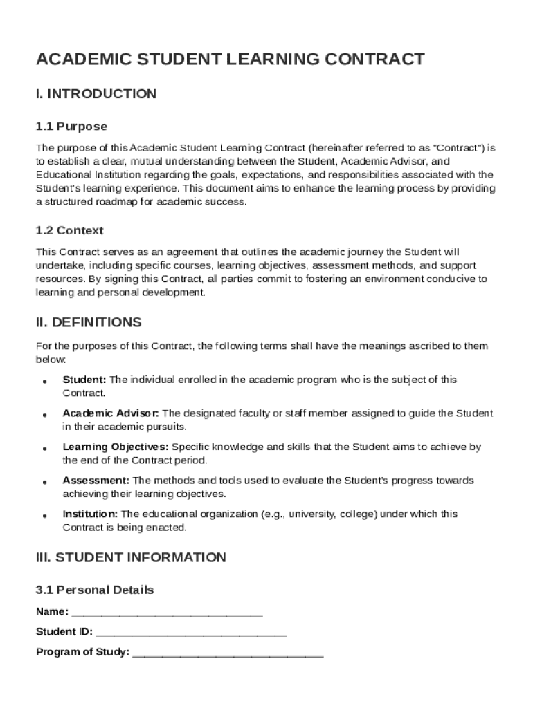 An Academic Student Learning Contract is a formal agreement between a student and an academic advisor or institution. This document outlines the student's learning objectives and responsibilities and serves as a roadmap for the educational journey.