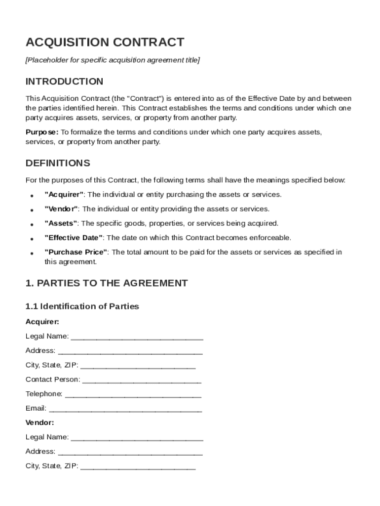 An Acquisition Contract Template is a formal document that outlines the terms and conditions for acquiring goods or services between two parties.