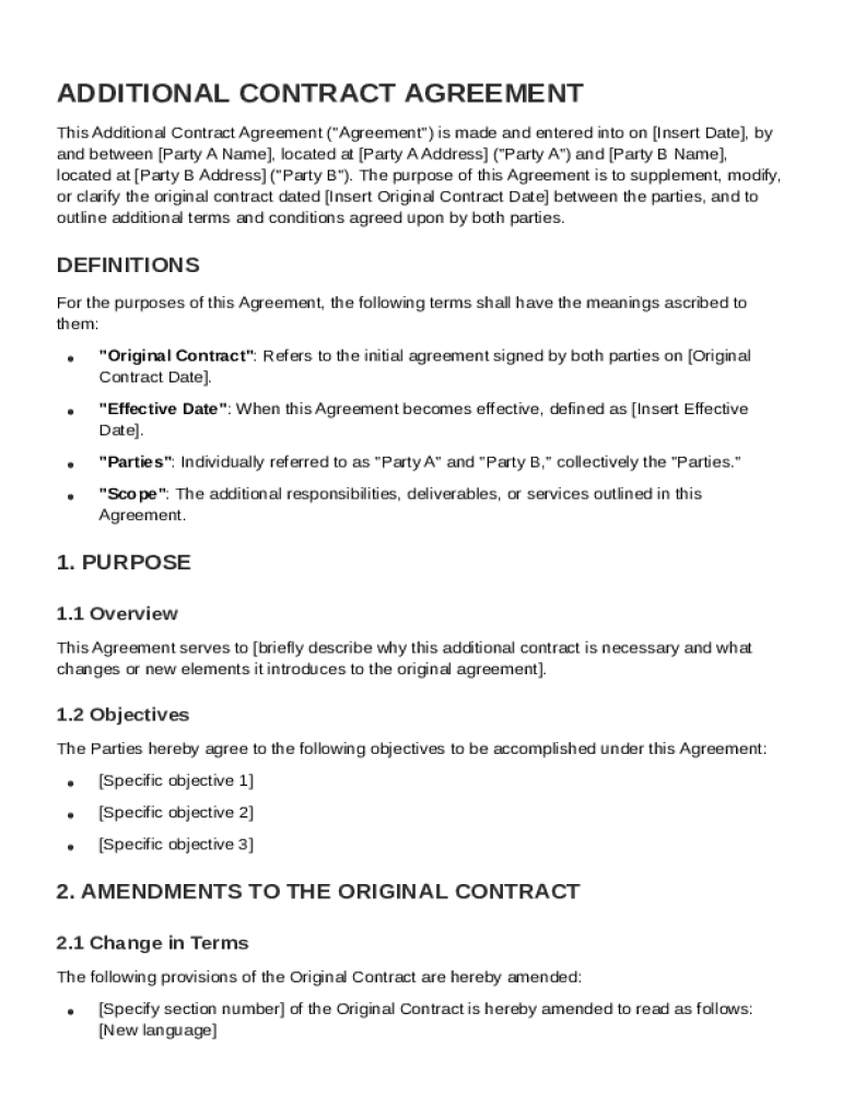 An Additional Contract Agreement serves to amend an existing contract while providing legal validity to new terms.