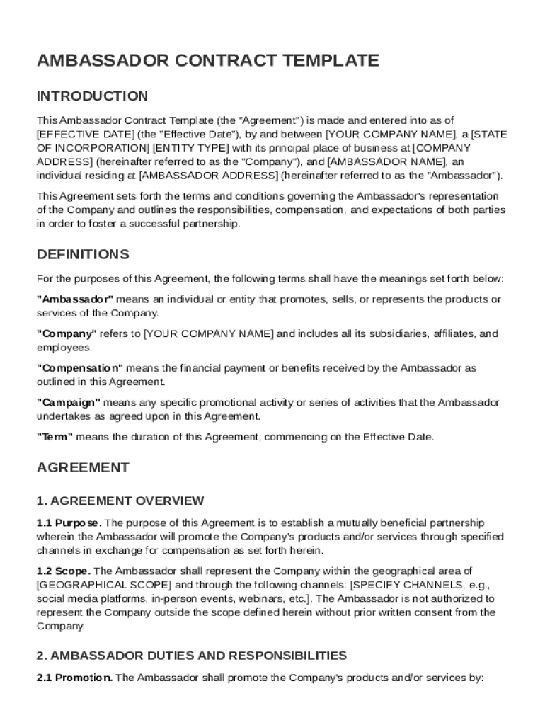 Filling out the Ambassador Contract Template correctly is crucial for establishing a successful partnership. Start by identifying the parties involved and the Effective Date.