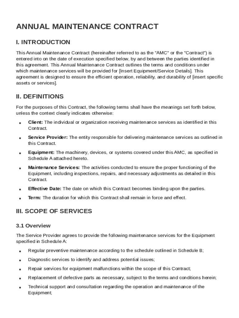 An Annual Maintenance Contract is a formal agreement between a client and a service provider that outlines the terms for maintenance services over a year. These contracts are essential for maintaining operational efficiency while ensuring equipment reliability. The key components of an AMC include the roles of both the client and the service provider, which delineate responsibilities and expectations.