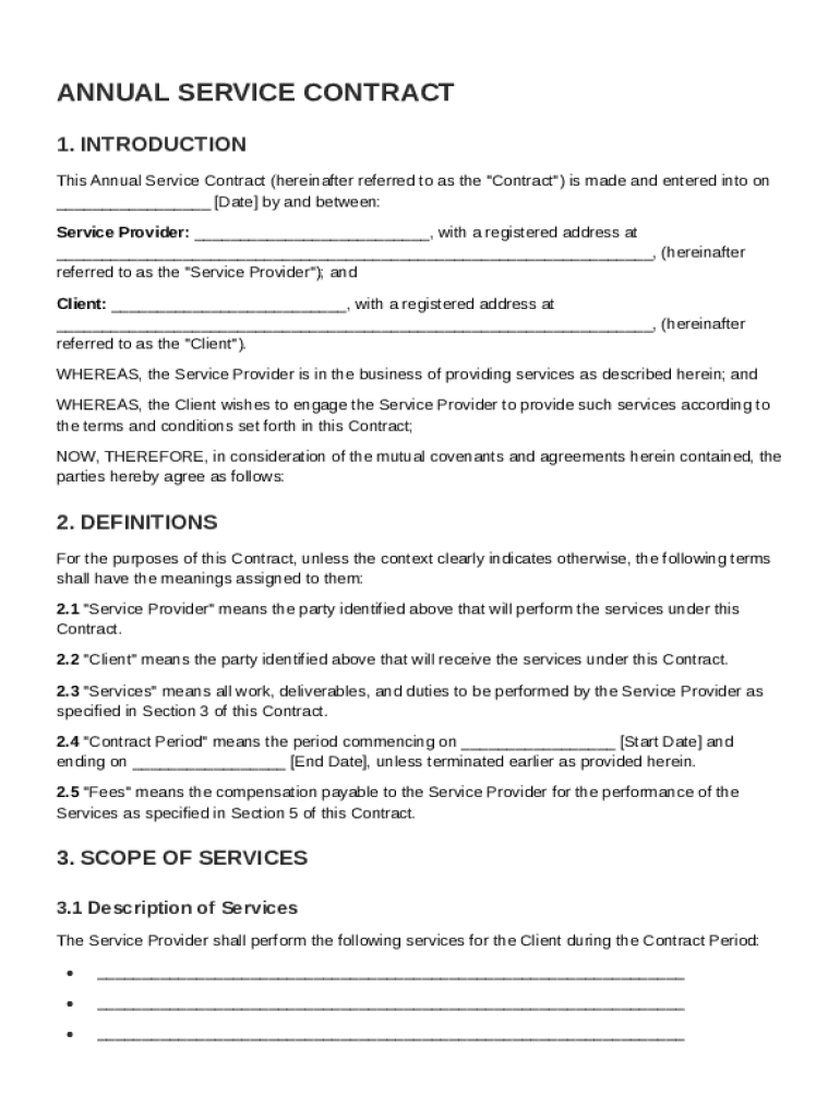 Examining a sample Annual Service Contract can offer insights into structuring your own contract effectively. It provides a reference point for important sections within your own document.