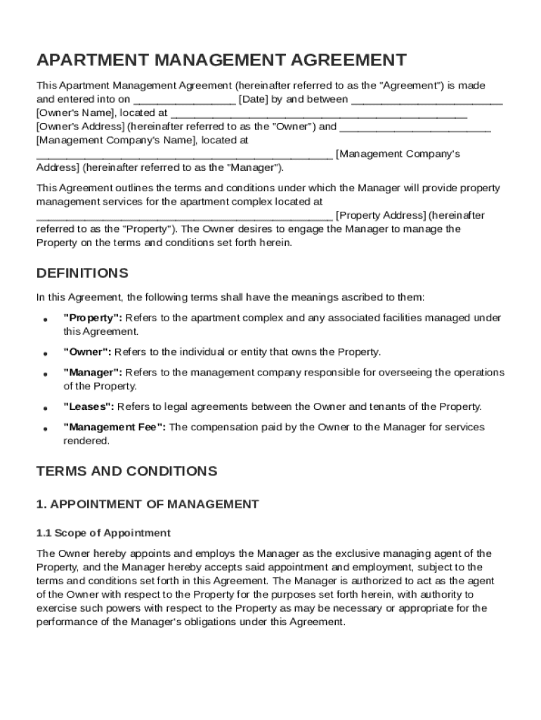 This document outlines the terms and conditions under which a management company will provide property management services for an apartment complex, detailing responsibilities, rights, fees, and legal