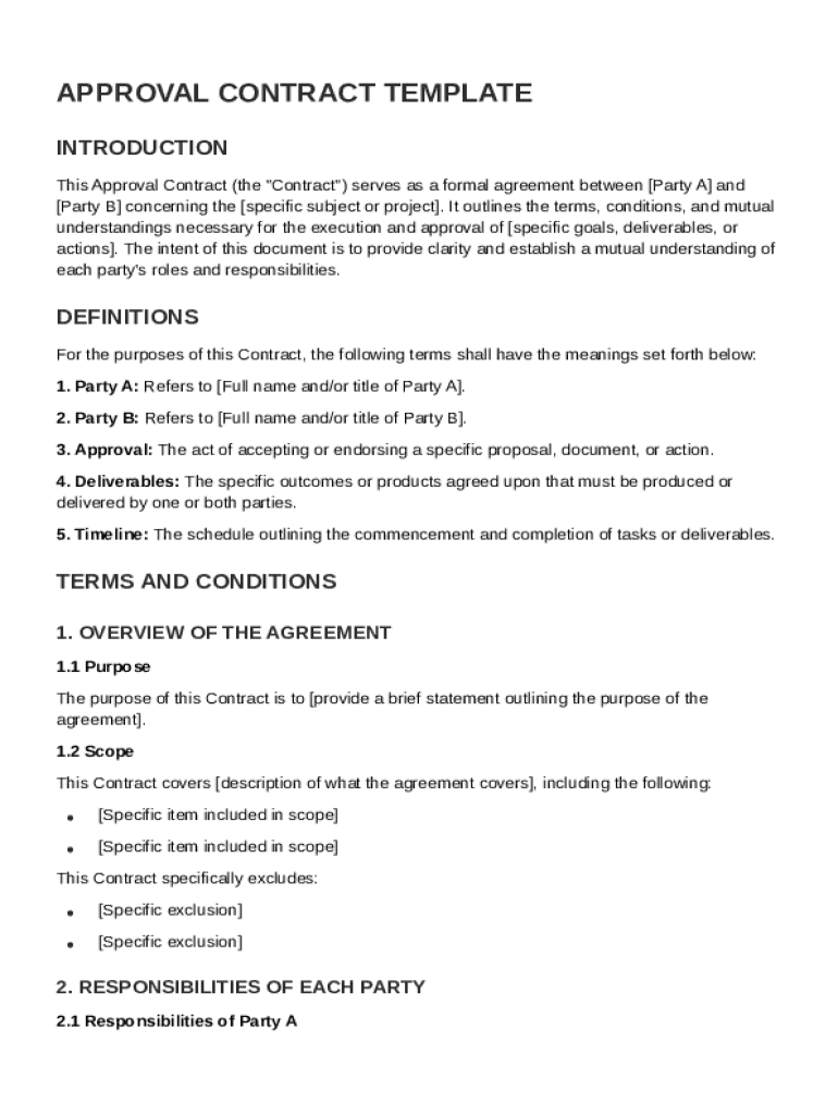 An Approval Contract Template is a pre-formatted document that outlines the terms and conditions under which approval or consent is granted by one party to another.