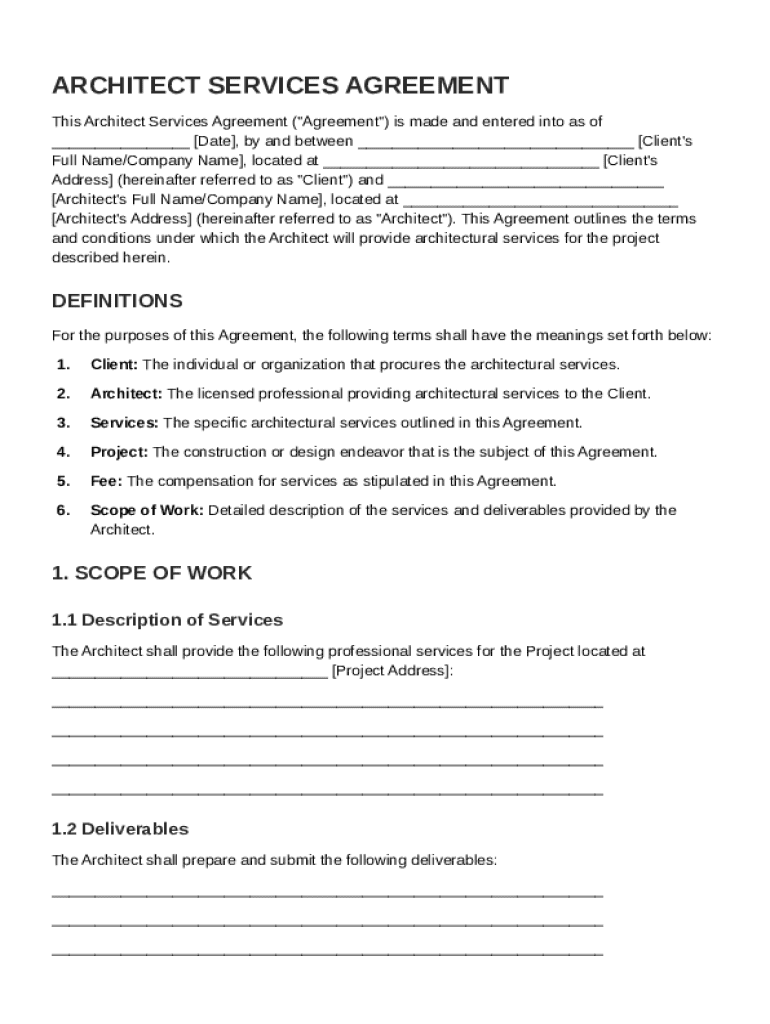 An Architect Services Agreement is a formal contract defining the relationship between a client and an architect for specific services. This document establishes the expectations and responsibilities of both parties, protecting their interests throughout the project.