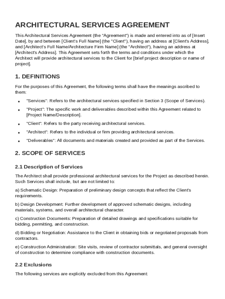 An Architectural Services Agreement is a legal document that outlines the terms, expectations, and responsibilities between an architect and their client. Having a well-defined contract is critical in architectural projects as it ensures that all parties are aware of their obligations and limits the risk of disputes.