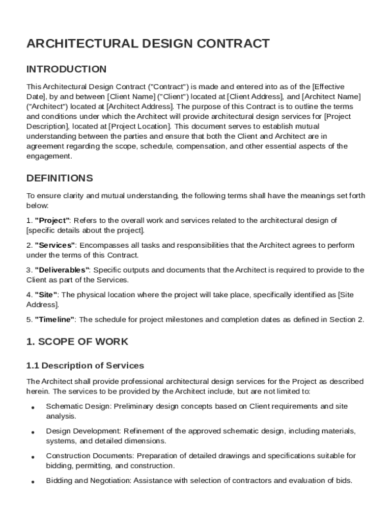 An Architectural Design Contract is a legal document that outlines the terms and conditions under which architectural services are provided. It serves both as a binding agreement between the client and the architect and as a reference document for the project's scope. Understanding this contract is crucial for both parties to avoid disputes.