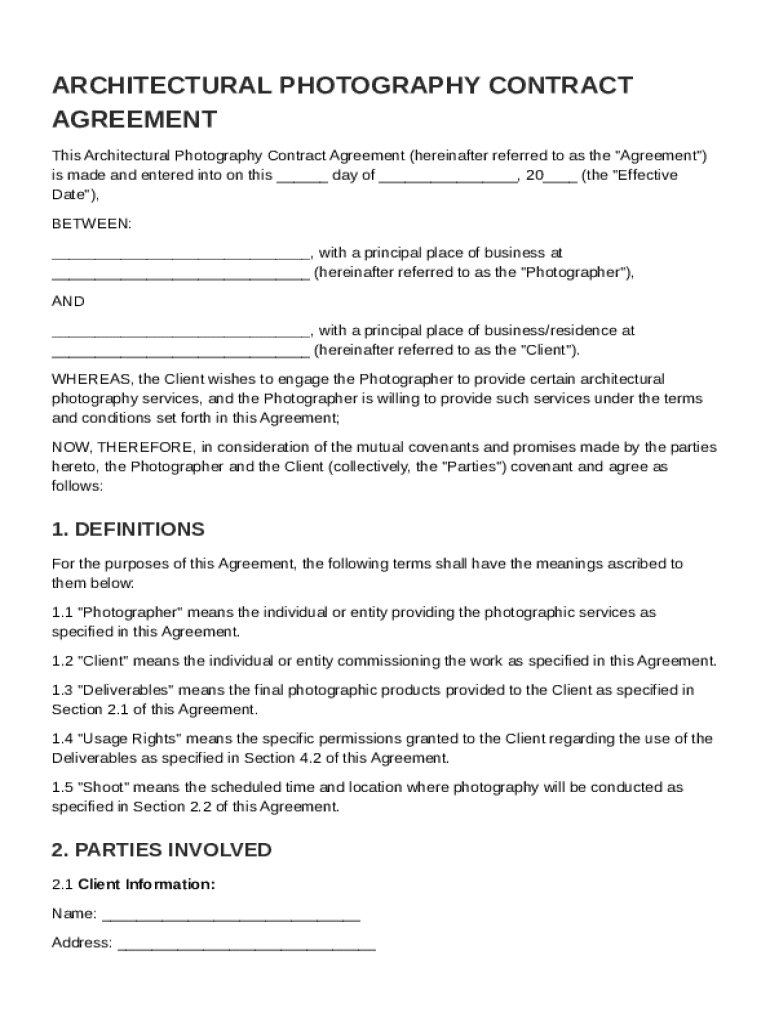 This template is used whenever an architectural photographer engages with clients for projects. It is essential for ensuring clarity on terms, responsibilities, and expectations between parties, preventing misunderstandings and legal disputes.