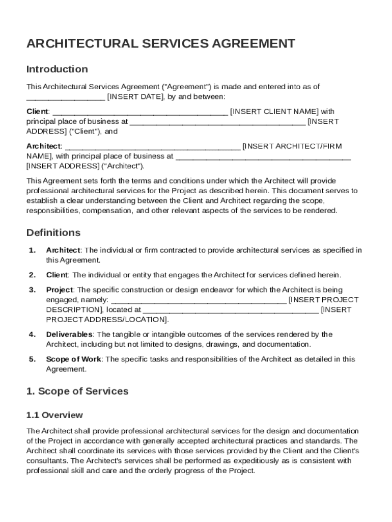This document outlines the terms and conditions under which professional architectural services are to be provided by the Architect to the Client, detailing responsibilities, compensation, and project
