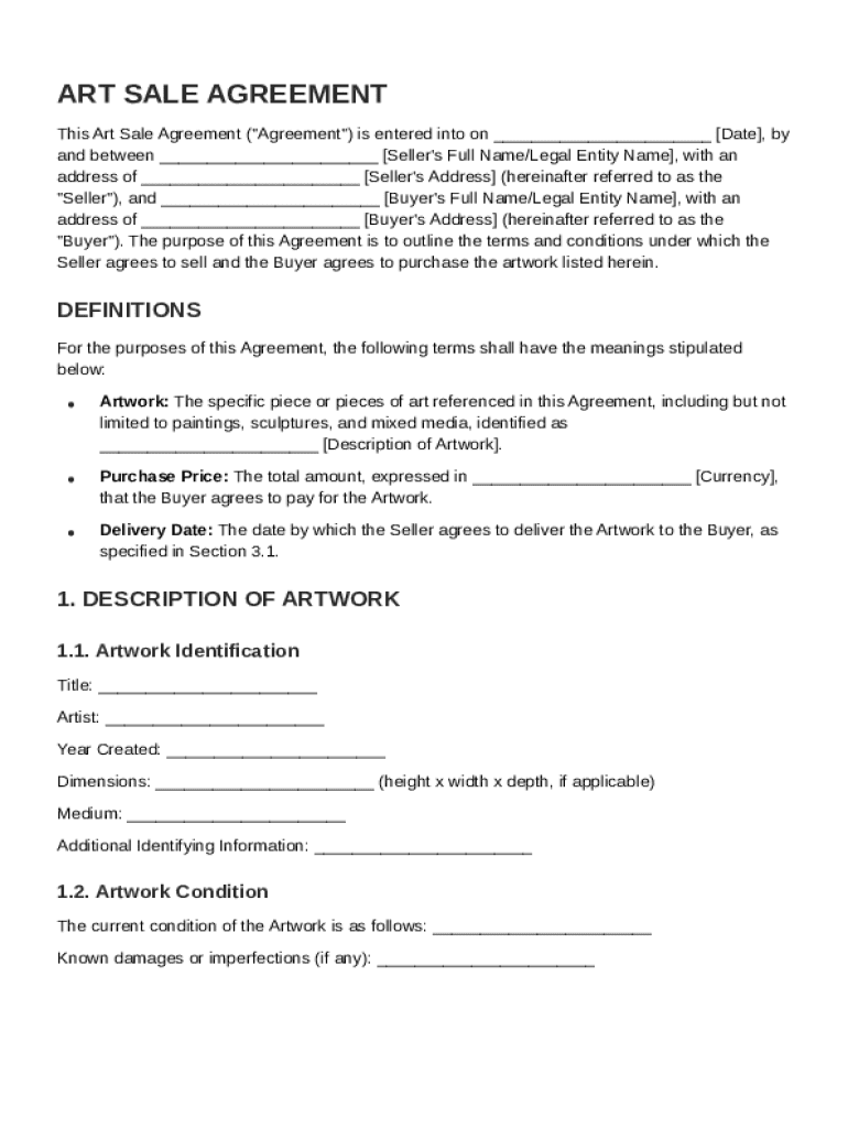 An art sale agreement is a legal document that outlines the terms under which artwork is sold. This document serves to protect both the seller and the buyer, ensuring mutual understanding and agreement on the sale's essential details.