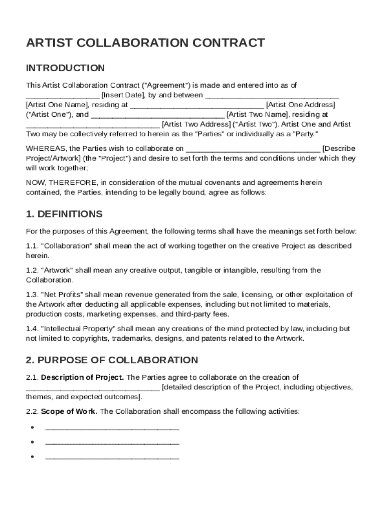 An Artist Collaboration Contract Template is a legal document that outlines the terms and conditions agreed upon by artists collaborating on a project.