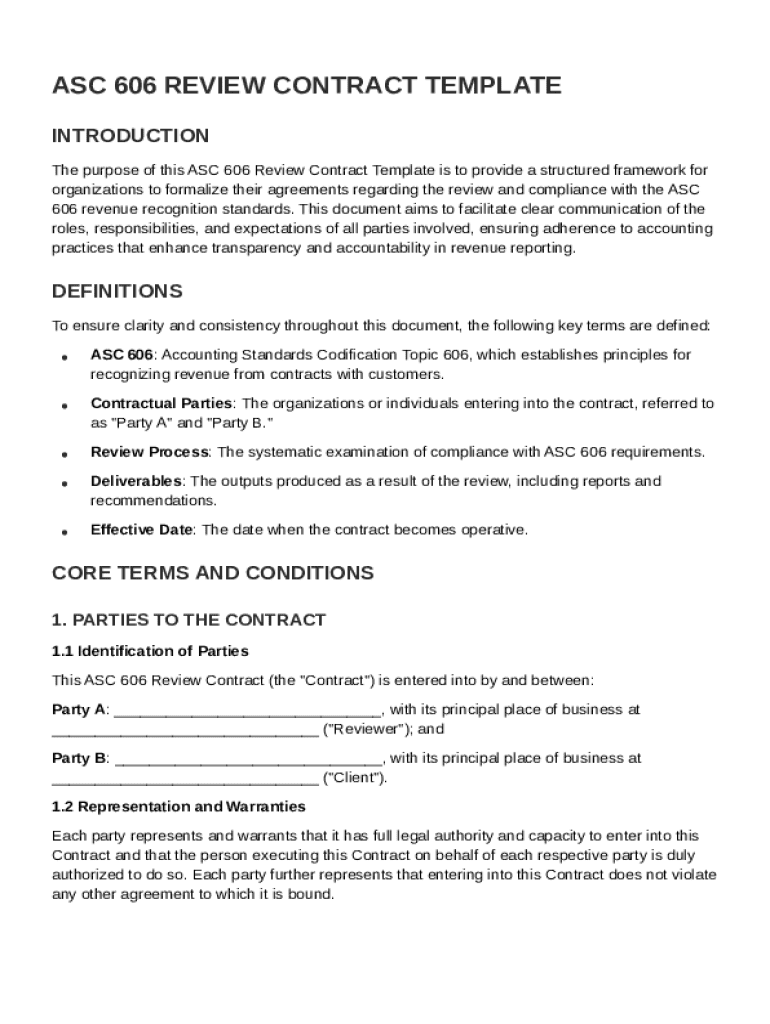 The Asc 606 Review Contract Template is a standardized document designed to ensure compliance with revenue recognition principles outlined in ASC 606.