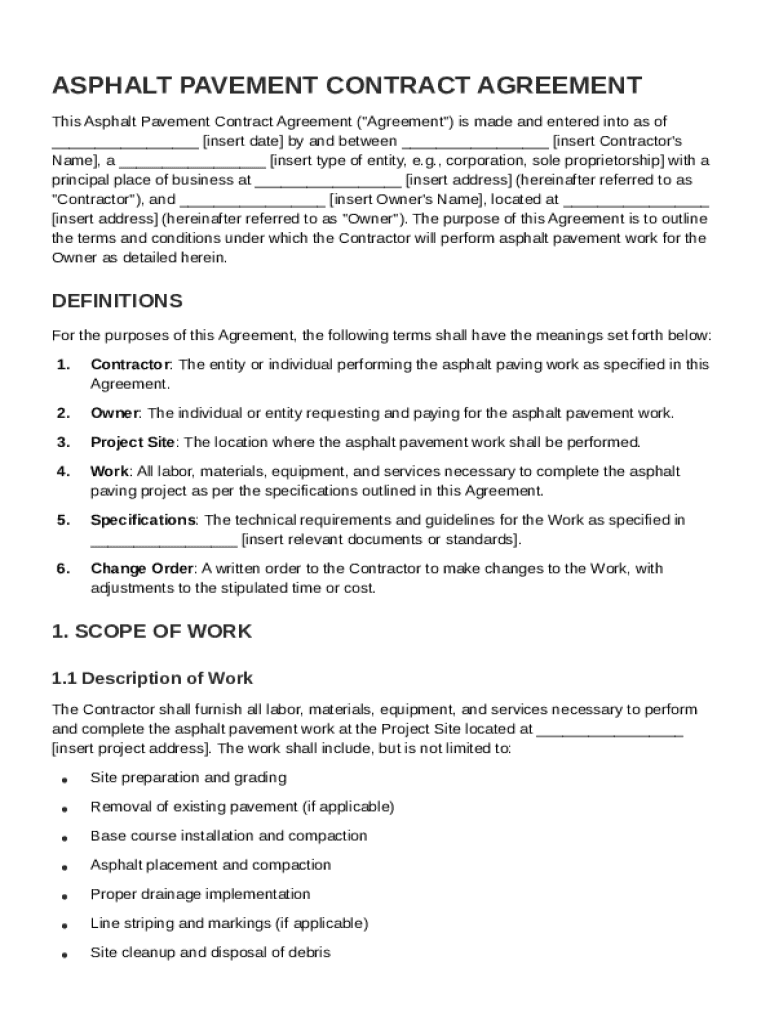 This document serves as a formal agreement outlining the terms and conditions for asphalt pavement work between the Contractor and the Owner.