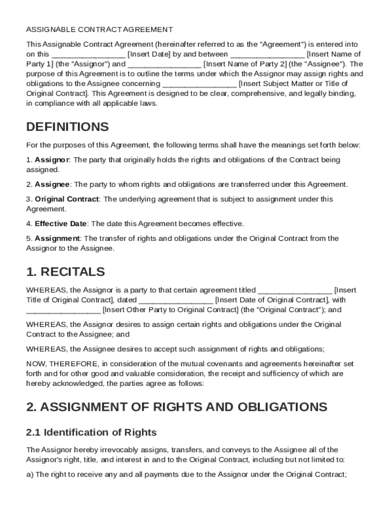 An Assignable Contract Template is a legal document that allows one party to transfer their rights and obligations under a contract to another party.