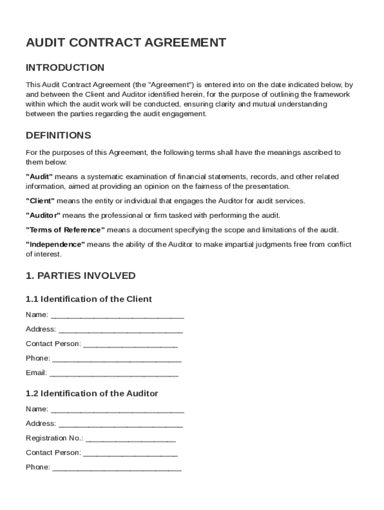 An Audit Contract Template outlines the fundamental terms and conditions between the auditor and the client, establishing a clear framework for the audit process. Its primary purpose is to ensure both parties understand their roles, responsibilities, and the scope of the audit.