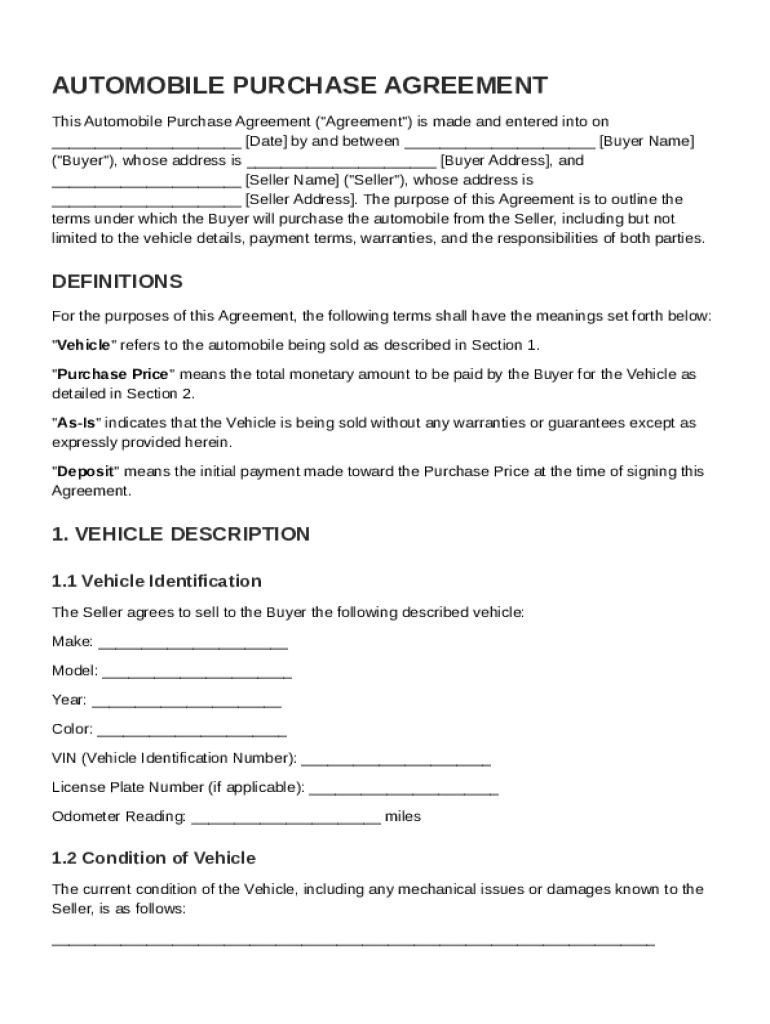 An automobile purchase agreement is a legally binding document that outlines the terms of sale between the buyer and the seller. Each party's obligations, as well as the specifics of the vehicle, are detailed within this agreement to minimize disputes and ensure clarity.