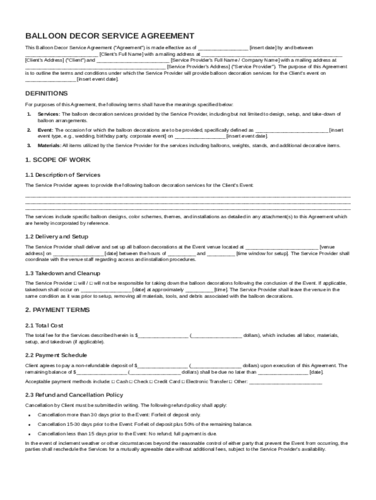 This document outlines the terms and conditions for balloon decoration services provided by a service provider for a client\'s event.