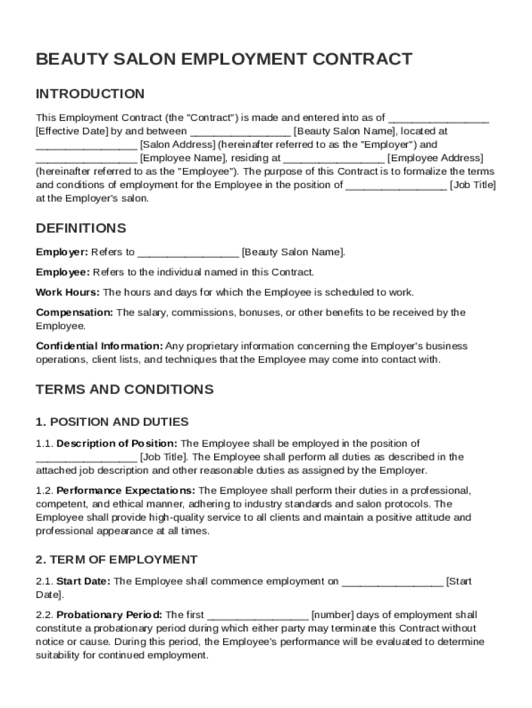 This Employment Contract formalizes the terms and conditions of employment for an Employee in a beauty salon, detailing position, duties, compensation, work hours, benefits, confidentiality, termination,