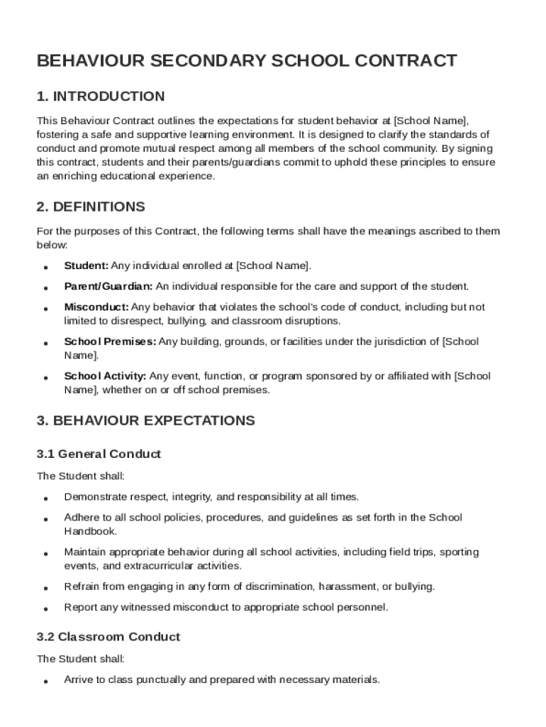 Definition and key provisions of a Behaviour Secondary School Contract Template