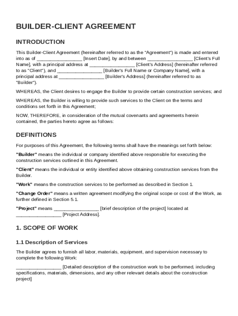 This document is a legal agreement outlining the terms and conditions between a builder and a client for construction services, including scope of work, compensation, responsibilities of both parties,