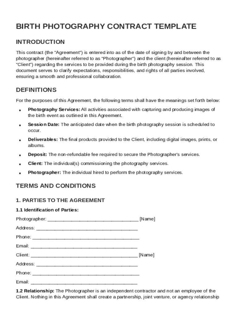 A Birth Photography Contract Template is a legal document that outlines the terms and conditions between a photographer and their client regarding birth photography services.