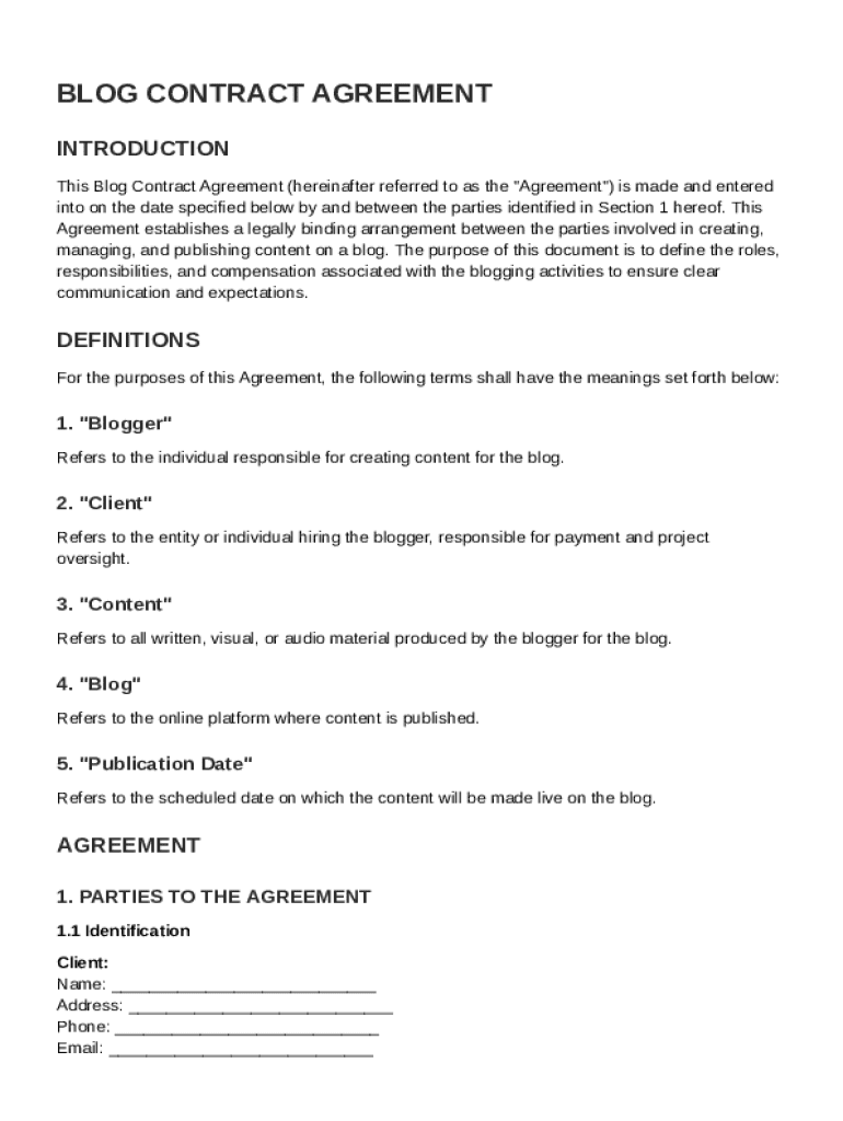 A Blog Contract Template is a formal document that outlines the terms and conditions between a blogger and a client regarding the creation and publication of blog content.