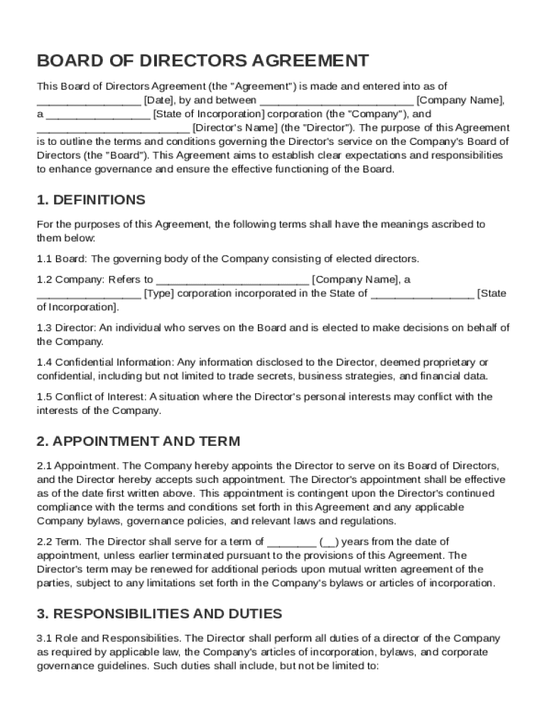 A well-structured Board Of Directors Contract Template form includes several key elements that are vital for effective governance.