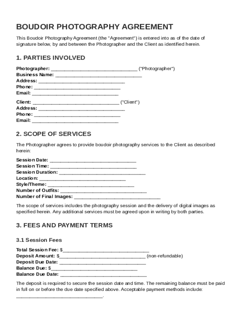 This document serves as a binding agreement between a photographer and a client for boudoir photography services, outlining the terms of service, fees, cancellation policy, image usage rights, and