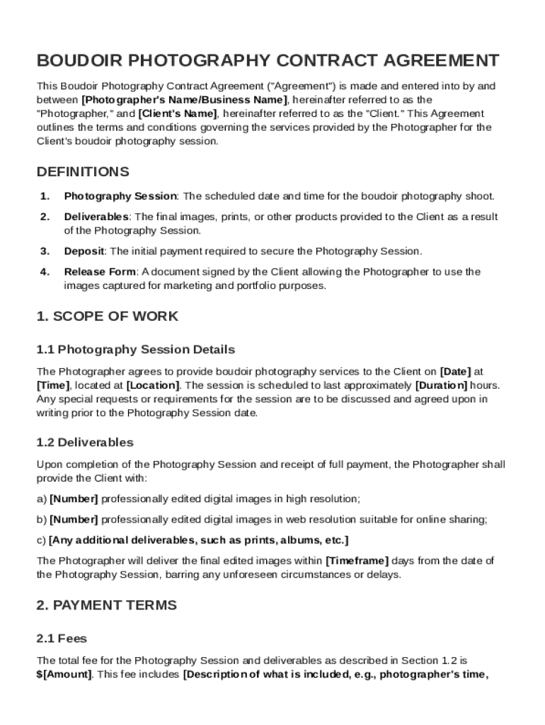 This document outlines the terms and conditions governing boudoir photography services provided by the Photographer to the Client.