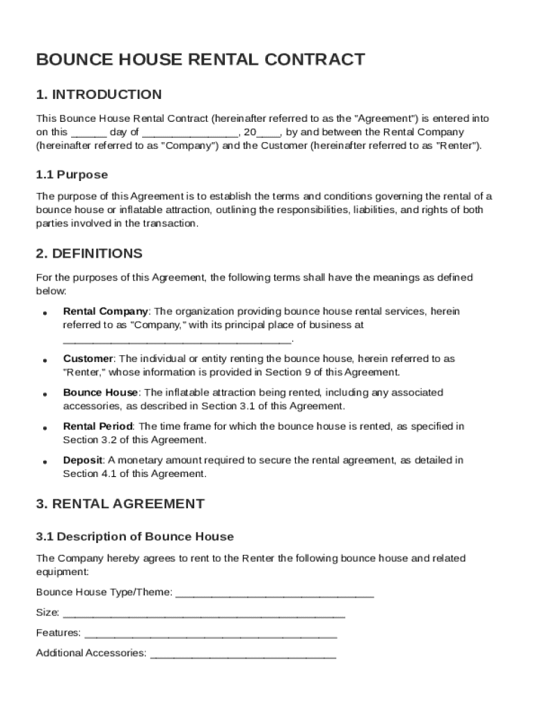 This document outlines the terms and conditions for renting a bounce house, detailing the responsibilities, liabilities, and rights of both the Rental Company and the Customer.