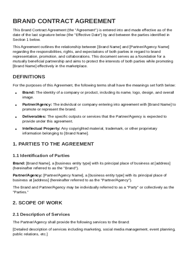 Accurate identification of the parties involved is essential for the legal validity of the Brand Contract Template. Each party's name, address, and official business entity should be included. This also applies to any relevant individual representatives authorized to act on the party's behalf.
