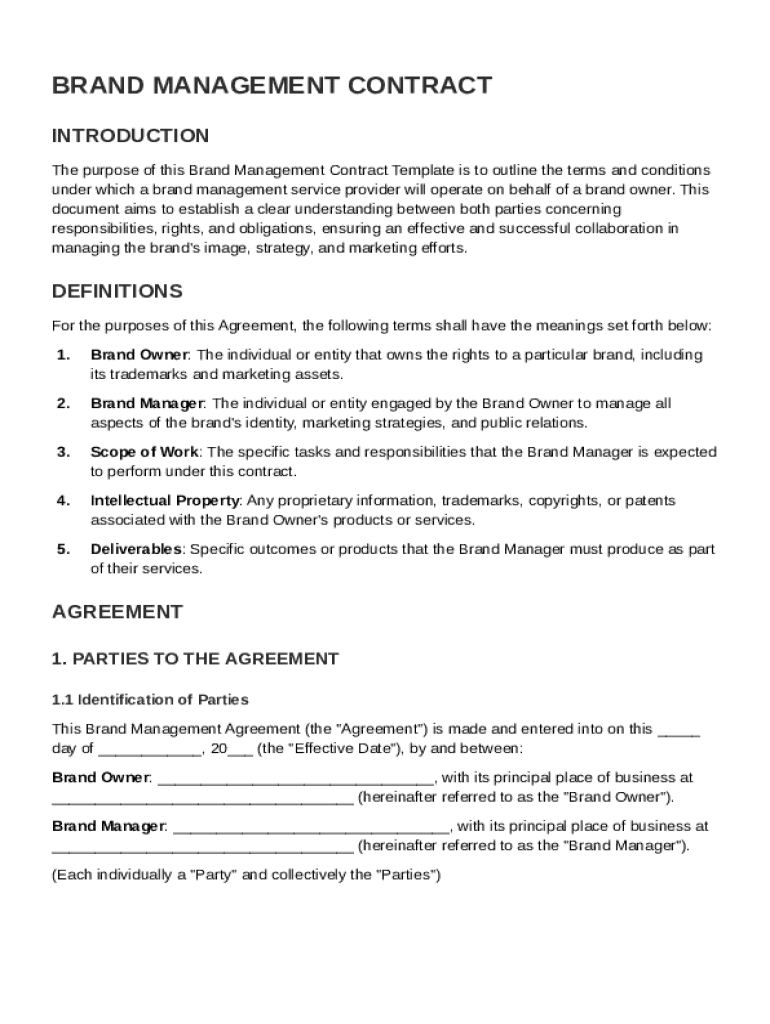 This document outlines the terms and conditions between a brand owner and a brand management service provider for effective collaboration in managing the brand\'s image, strategy, and marketing efforts.