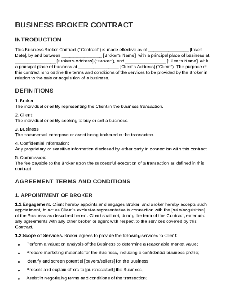 Definition and purpose of a Business Broker Contract: This contract serves to facilitate the sale process by detailing key aspects that govern the relationship between broker and client.