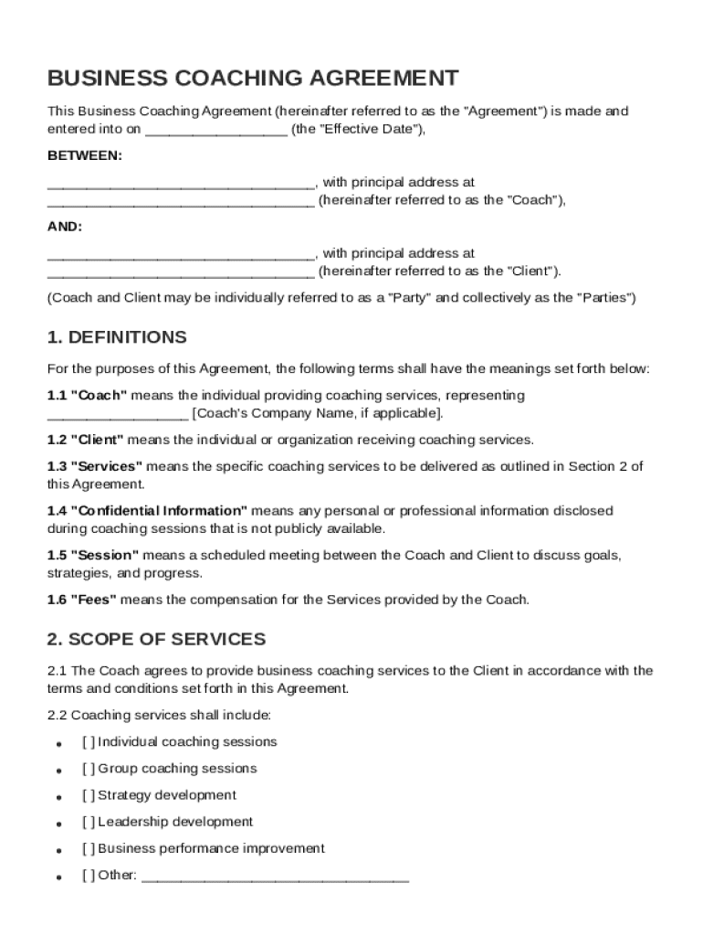 This document outlines the terms and conditions of a business coaching relationship between a coach and a client, detailing the scope of services, fees, confidentiality, responsibilities, and termination