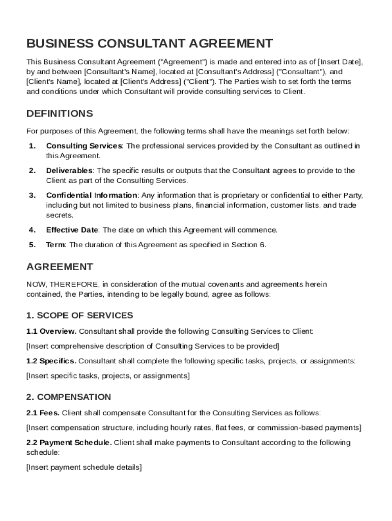 Understanding the components of a Business Consultant Agreement is essential to drafting a comprehensive contract that protects the interests of both parties. A typical agreement includes several critical definitions and clauses.