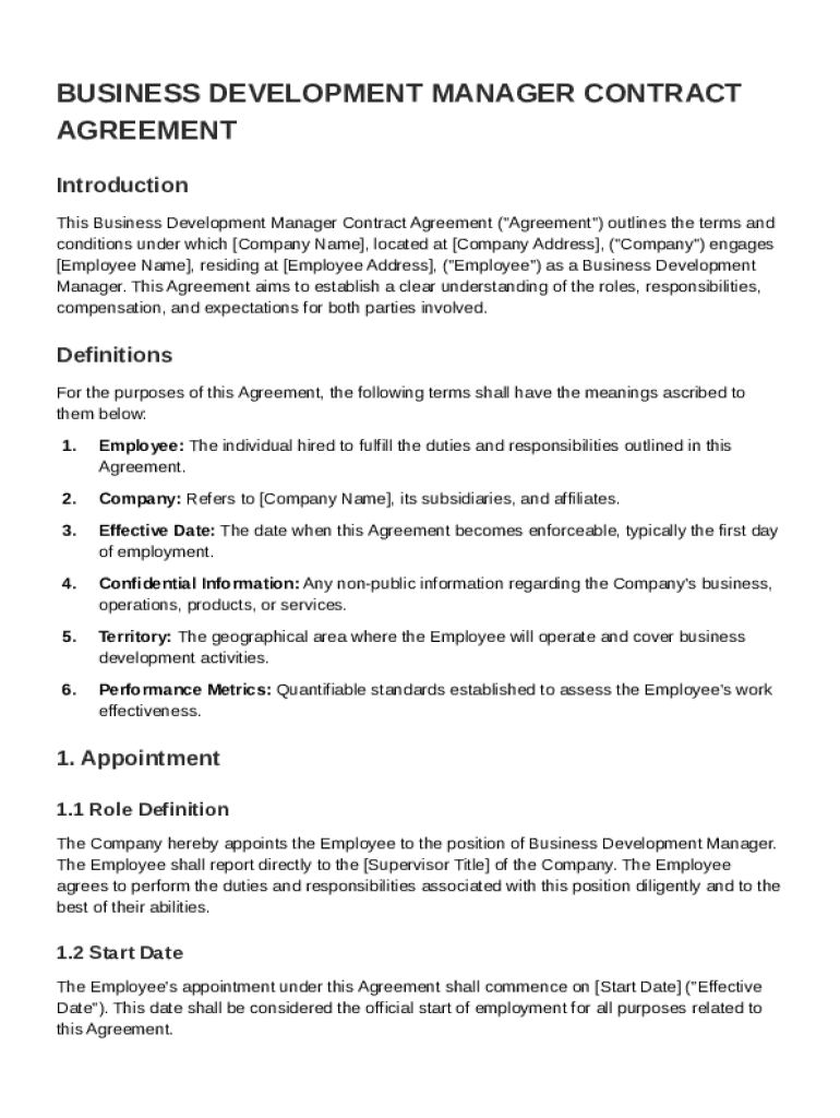 This document outlines the terms and conditions under which a company engages an employee as a Business Development Manager, detailing roles, responsibilities, compensation, benefits, performance