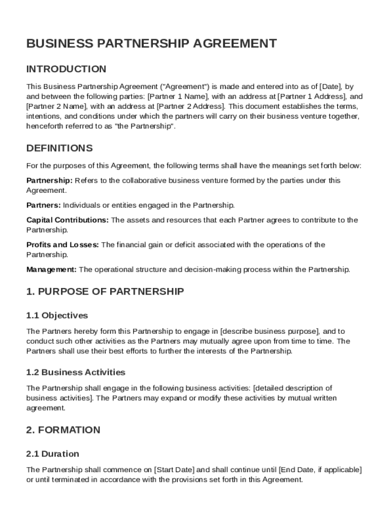 A business partnership agreement is a formal document that outlines the terms and conditions governing a partnership between two or more individuals or entities. This agreement establishes the rights, responsibilities, and profit-sharing arrangements of the partners involved.
