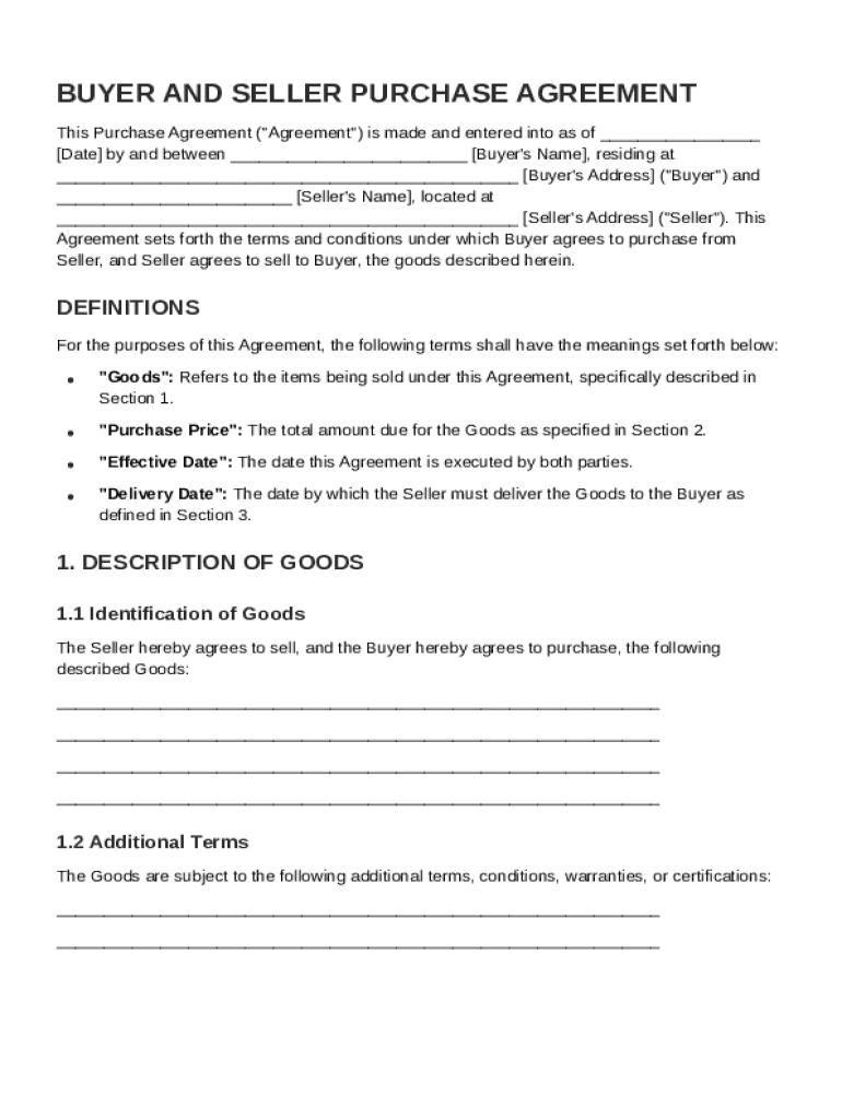 A Buyer and Seller Purchase Agreement is a legal document outlining the terms of sale between a buyer and seller. Its purpose is to protect both parties by clearly defining the rights, responsibilities, and obligations of each party involved in the transaction.