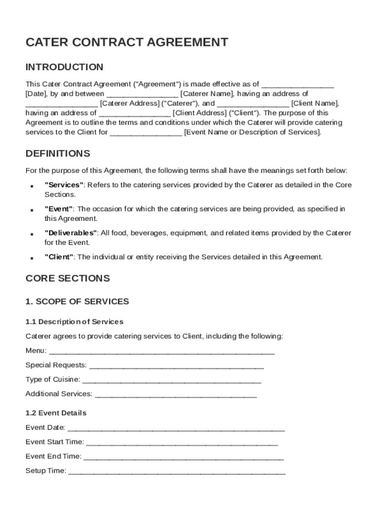 A well-crafted cater contract agreement includes critical components that accurately reflect the intentions of both parties. These components often cover essential details such as contact information for both the caterer and the client, alongside definitions of specific terms related to catering services.